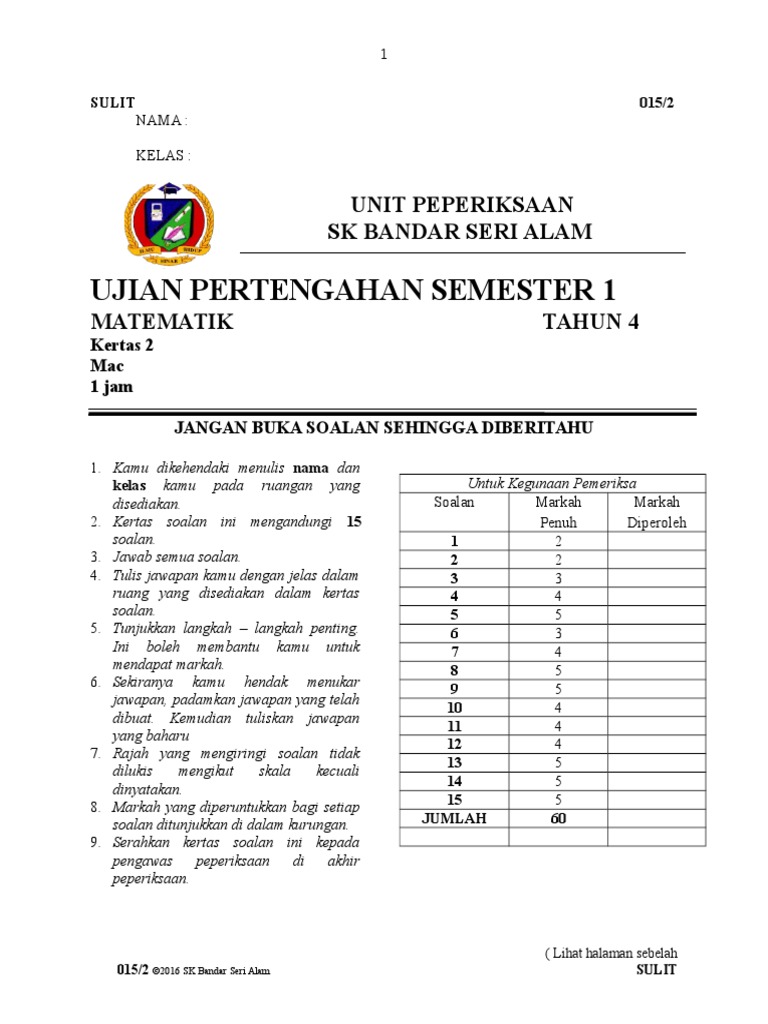 Jangan lupa share kepada kawan2 ya pada group whasapp dan telegram. Peperiksaan pertengahan tahun dst tahun 1. Puedes hacer los ejercicios online o descargar la ficha como pdf. Pada kali ini, kami akan mengambil kesempatan untuk berkongsikan bank soalan ujian pertengahan tahun bagi tingkatan 4 bagi pelajar spm. Ujian progresif matematik tahun 4 kertas 1 224326711 pertengahan 2014 jsu soalan kssr pecahan persoalan s.