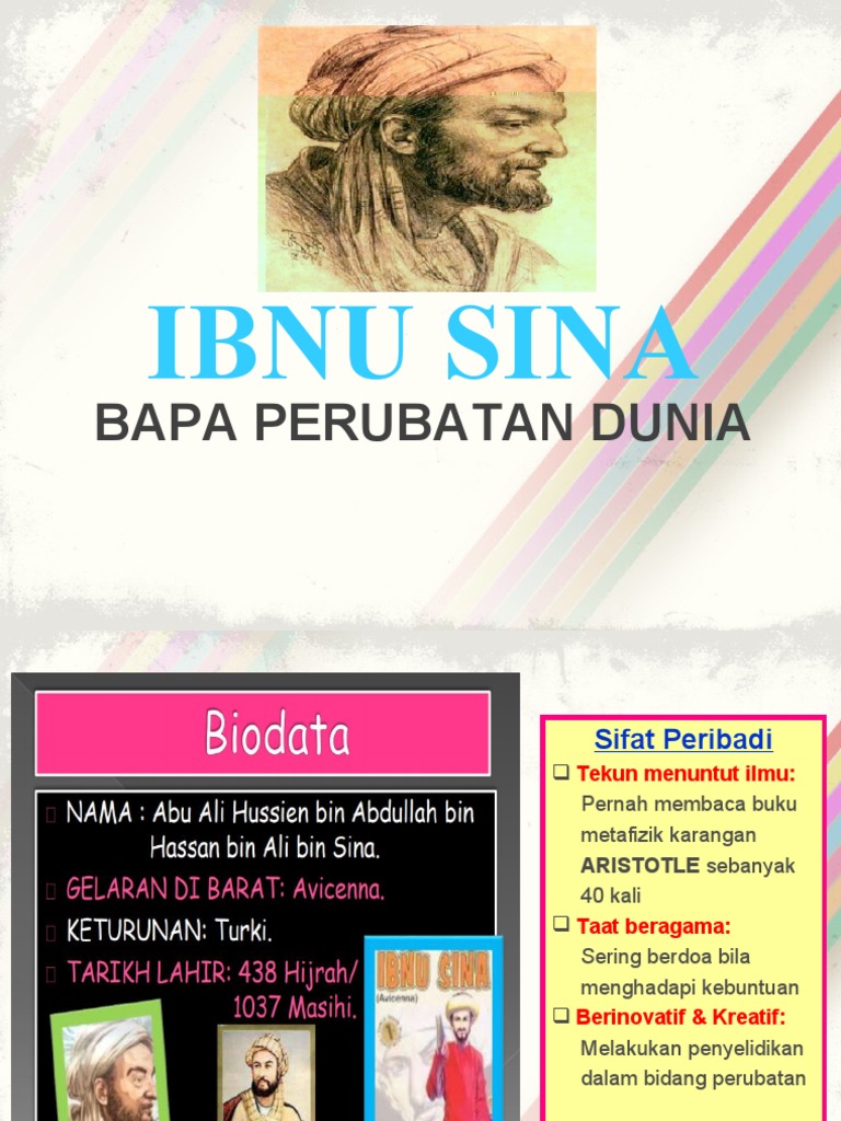 Ibnu Sina from image.slidesharecdn.com Disebabkan pelbagai input penting yang dibawa ibnu sina, tidak hairanlah selain dikenali sebagai bapa perubatan, orang barat. Ibnu sina merupakan seorang tokoh yang sangat terkenal dalam bidang perubatan. Ibnu sina bapa perubatan dunia. Karyanya yang sangat terkenal adalah qanun fi thib atau. Beliau merupakan bapa perubatan moden dan banyak hasil kajiannya yang masih digunakan dalam teknologi perubatan moden pada hari ini. Para penulis barat menganggap ibn sina sebagai 'bapa doktor perubatan' kerana ibn sina telah berjaya gelaran lain yang pernah diberikan kepadanya ialah raja ubat. · hussin bin abdullah bin hassan bin ali bin sina. Ibnu sina, ilmuwan muslim yang satu ini tentu sudah tak asing lagi di telinga kita.