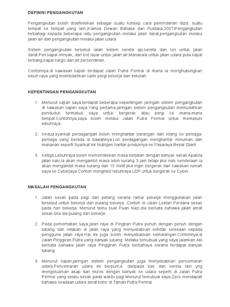 Pengangkutan boleh didefinisikan sebagai suatu konsep cara pemindahan daripada terdapat tiga jenis pengangkutan awam. Hal ini mungkin kerana sektor pengangkutan di malaysia adalah satu sektor penting yang berkait rapat dengan ekonomi, sosial dan politik. Apakah sumbangan pengangkutan awam dan masalah yang dihadapi dalam sektor pengangkutan awam? Buitrannya boleh anda semak seperti di bawah ini pengangkutan awam juga adalah merupakan pengangkutan yang dikenakan bayaran dan digunakan oleh orang ramai yang telah disediakan oleh pihak awam. Kerja lapangan / tugasan geografi.